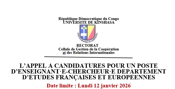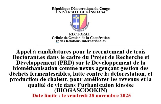 la Cellule de la Coopération et des relations internationales informe la communauté universitaire de l’Appel à candidatures pour le recrutement de trois Doctorant.es dans le cadre du Projet de Recherche et Développement (PRD) sur le Développement de la biométhanisation comme nexus agençant gestion des déchets fermentescibles, lutte contre la déforestation, et production de chaleur, pour